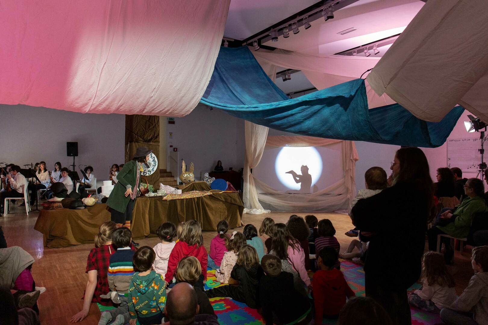 Uno spazio scenico condiviso tra grandi e piccoli per ascoltare una storia attraverso le voci degli strumenti e i suoni nascosti tra le pagine di partiture sapientemente arrangiate per un’orchestra di bambini e un pubblico di piccoli spettatori.