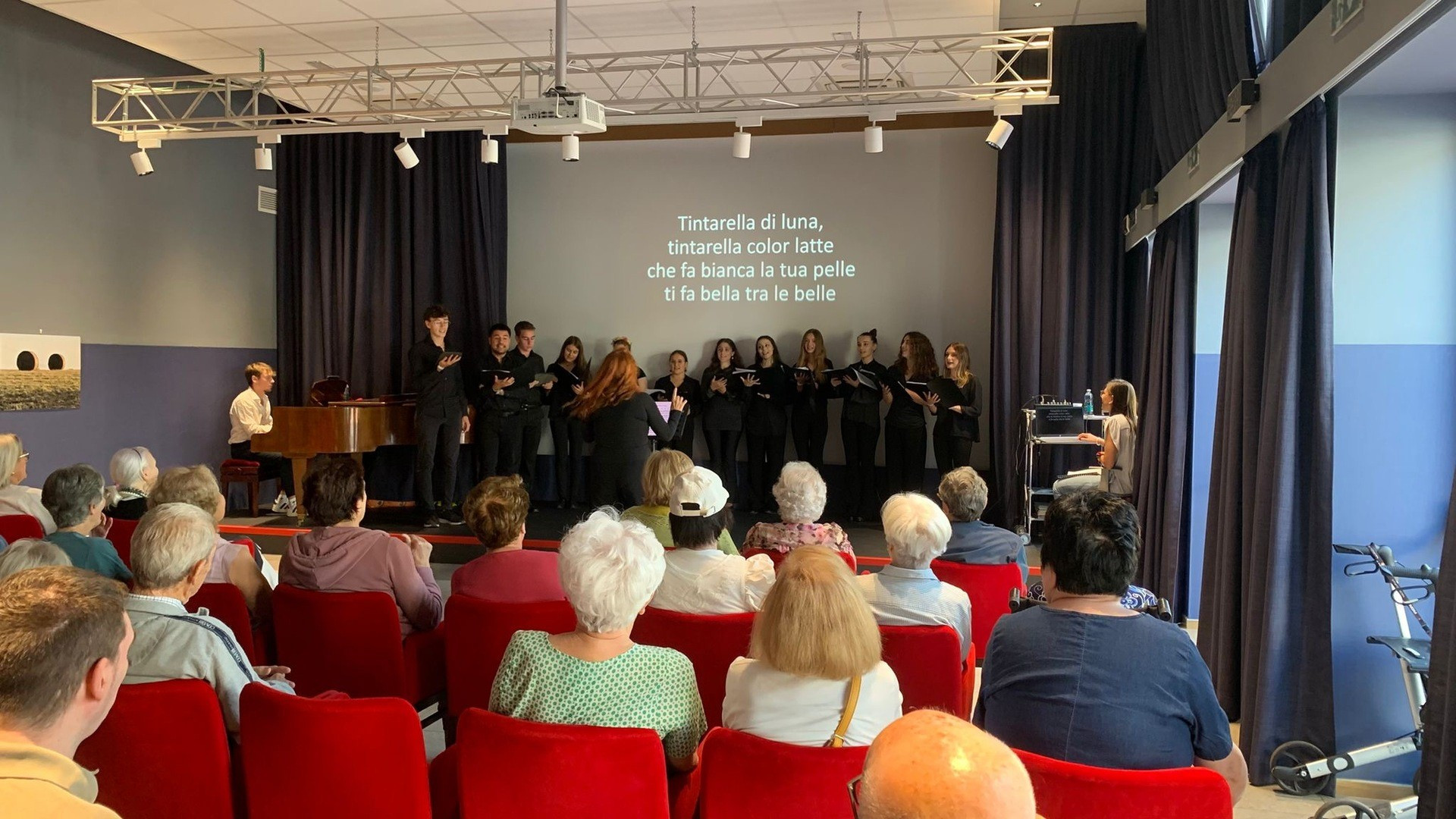 Durante il laboratorio sono stati proposti alcuni tra i brani più amati della canzone italiana, accanto a celebri pagine verdiane, capaci di risvegliare ricordi ed emozioni condivise. Si è passeti dalla spensierata leggerezza di Tintarella di luna di Franco Migliacci e Bruno De Filippi a Un bacio a mezzanotte di Gorni Kramer, fino al sorriso ironico di Papaveri e papere di Vittorio Mascheroni. Non sono mancati successi senza tempo come Nel blu dipinto di blu di Domenico Modugno, Il cielo in una stanza di Gino Paoli e Io vagabondo dei Nomadi. A impreziosire il percorso musicale sono stati infine due capisaldi del repertorio verdiano: il celebre "Brindisi" da La traviata e il corale "Va’ pensiero" da Nabucco.